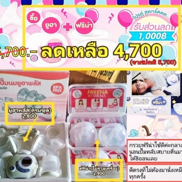ใช้โค๊ดNEWMUM3 ลด500- Youha+Freena เครื่องปั๊มนม+กรวยแฮนด์ฟรีฟรีน่า ซึ่งเป็นสินค้าในหมวดหมู่ ทารกและของเล่น> แม่และเด็ก> เครื่องปั๊มนมไฟฟ้า ที่มีคุณสมบัติ คือ #เซ็ทคู่สุดประหยัด! ลดเหลือ 4,700.- (จากปกติ 5,700.-) #เซ็ทคู่ประกอบด้วย:- 1) ปั๊มคู่ยูฮาพลัส ประกัน 1 ปี (2,800.-) 2) กรวยฟรีน่า *ไม่รวมเครื่อง (2,900.-) *#ซื้อครั้งแรก(ไอดีใหม่)#ใช้โค๊ดNEWAUTOลด100.- *#ซื้อครั้งแรก(ไอดีใหม่)#ใช้โค๊ดNEWMUM3ลด500.- (ซื้อขั้นต่ำ 2,500.-) #ส่งด่วนEms 100.- #ขนส่งเอกชน(Kerry) ค่าส่ง 150.- กดเลือกช่องทางการจัดส่ง ผู้ขายทำการจัดส่งให้ #แลกซื้อเข็มขัดปั๊มนม ราคา 100.- (ปกติ 390.-) ไปที่➡️ประกาศ เข็มขัดปั๊มนม (แลกซื้อเข็มขัดปั๊มนม)